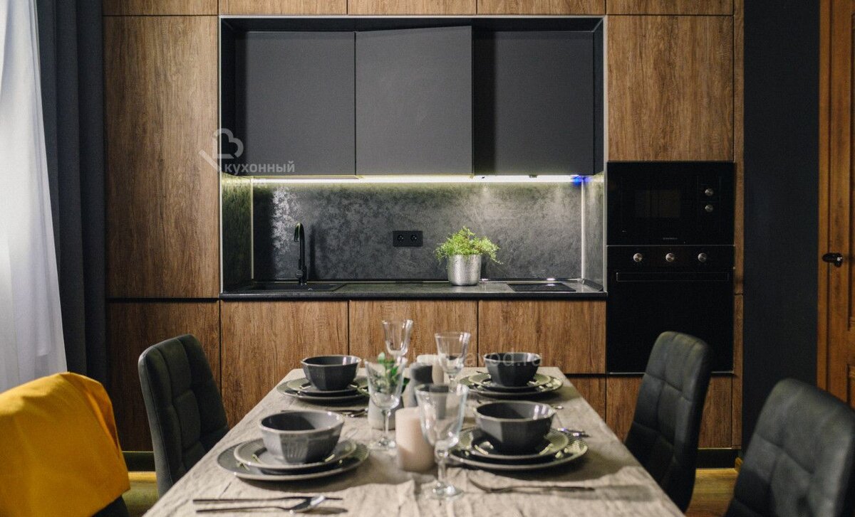 Благородное сочетание ореховых и матовых черных фасадов создает по-настоящему премиальный образ. Вся техника расположена на удобной высоте — никаких лишних наклонов!